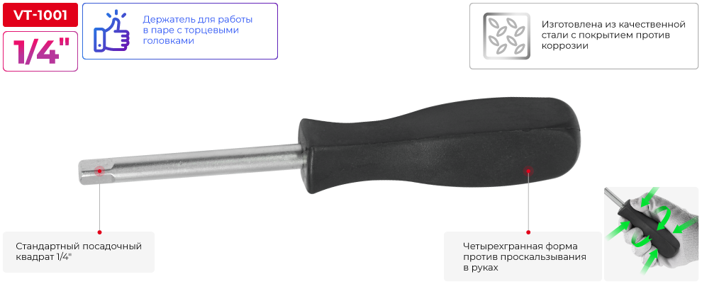 Тримач для головок має досить просту конструкцію й застосовується для роботи з різними кріпленнями. Головки кріпляться до посадкового квадрата 1/4". Ручка з гранями проти ковзання в долоні.